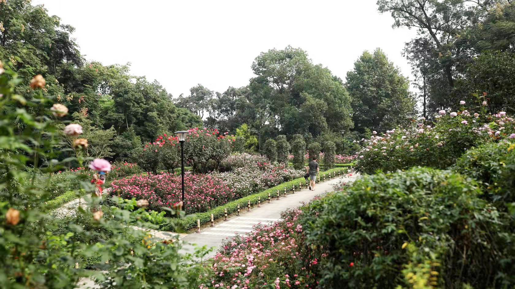 成都市植物园月季康养园位于植物园南大门入口区域,占地面积约为3700平方米。园内展示了包括绝色佳人系列、真宙、绯扇、蓝色阴雨等60余个月季品种,既有传统树状月季和造型月季,也有大面积品种展示区,用于展示园内多年收集、筛选的月季品种。