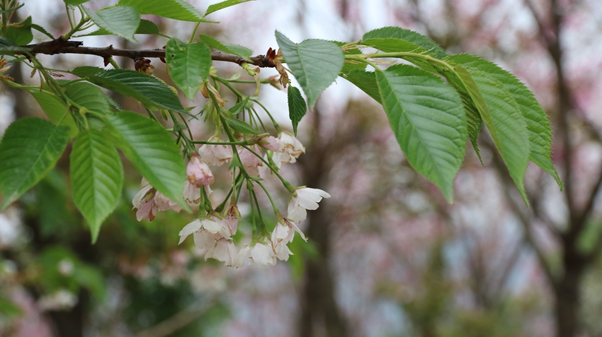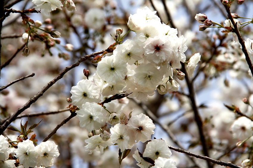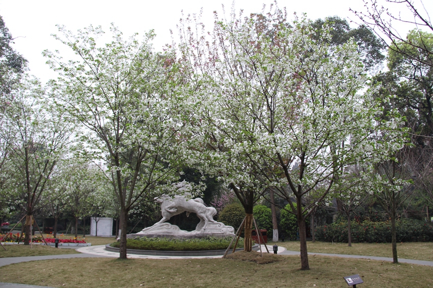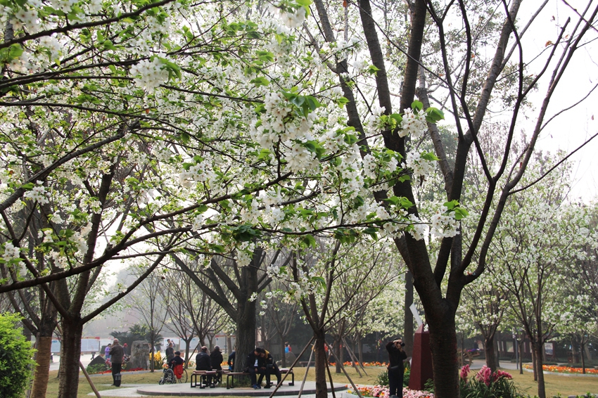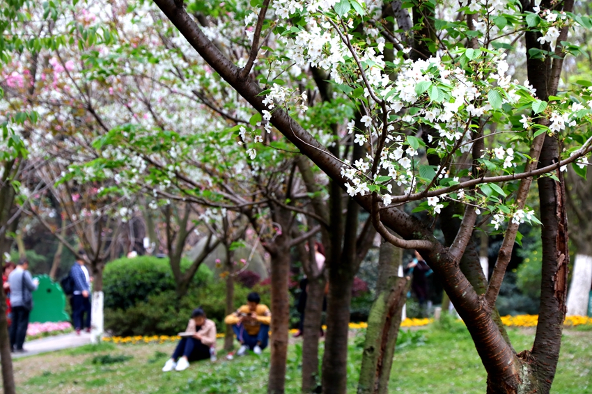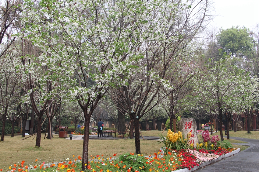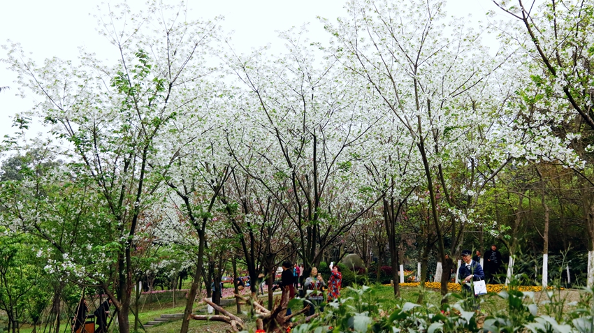 樱花园里,一簇簇洁白的花朵缀满枝头,正像是飘落的雪。日本晚樱也适时盛放,进一步丰富了樱花园的樱花品种和层次景观。
