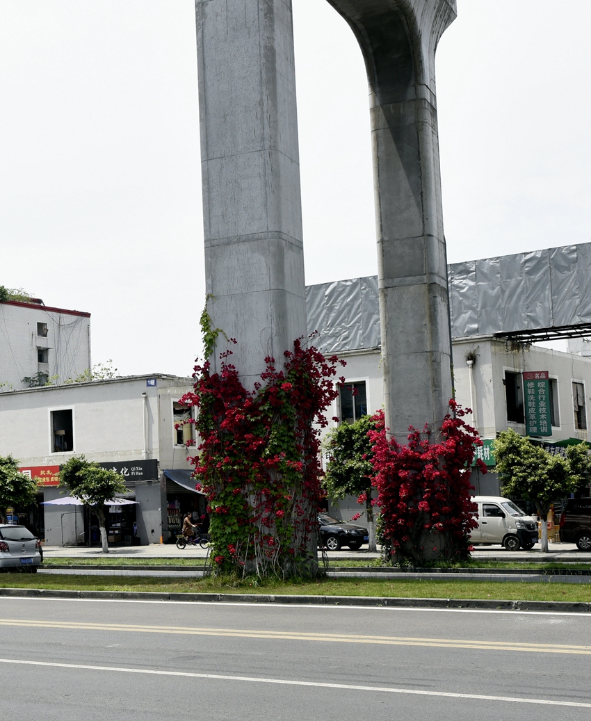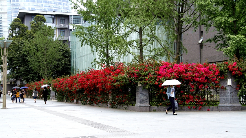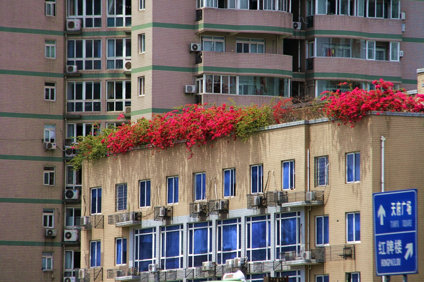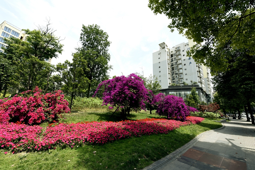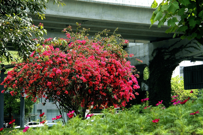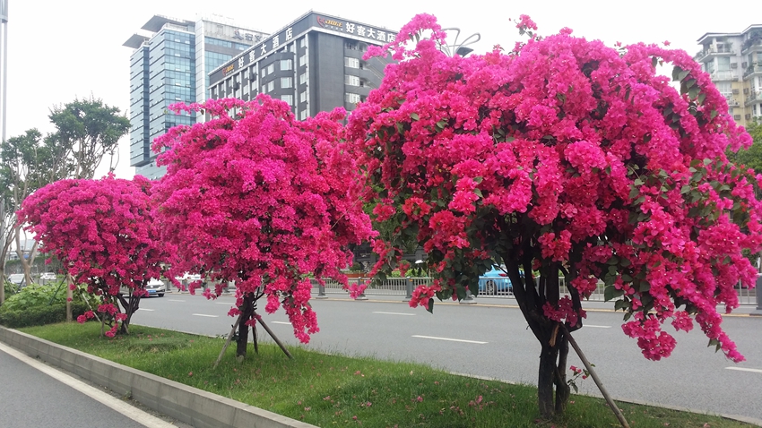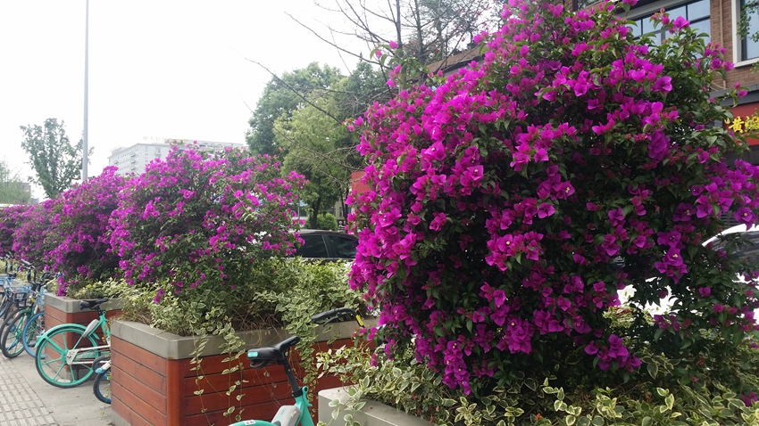 三角梅虽然种类不多,但因其花量繁多,花期长(可从5月一直盛开到10月左右),盛花时,热情奔放、灿烂夺目。人们对其极为喜爱,其育种培育也发展蓬勃,培育出了超多观赏价值极高的园艺品种。从花型上分有单瓣和重瓣,色系上分有单色、斑叶、渐变色等,其中单色就有白、粉红、水红、鲜红、暗红、紫红、蓝紫、柠檬黄等色,在加上复色品种,只色彩上够你眼花缭乱。再加上三角梅的藤蔓特性,可以作各种编艺造型、搭廊架亭、编篱爬墙……园林应用上形式方法多种多样,只用三角梅就能呈现不同的风景。目前,成都城区绿地、小游园、屋顶、露台、道路、花箱等几乎都有其身影,栽种较多的是红色系和蓝紫色。
