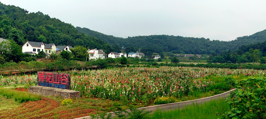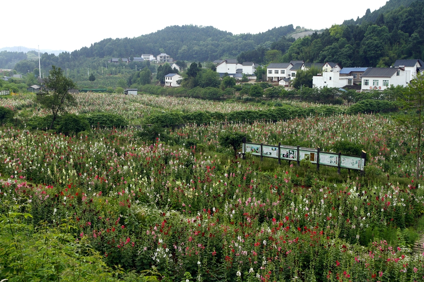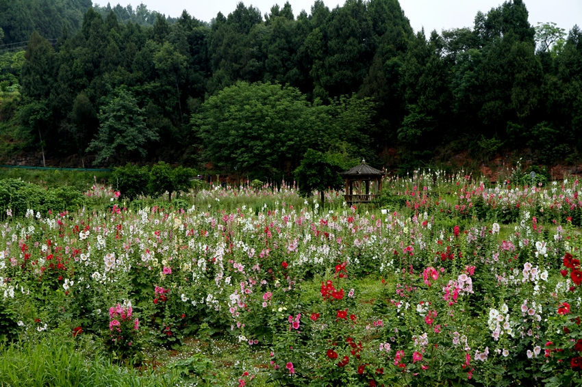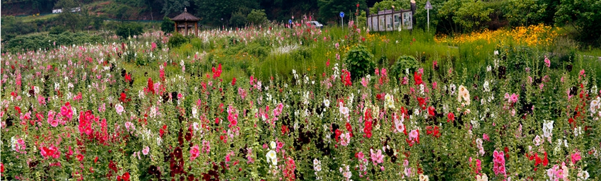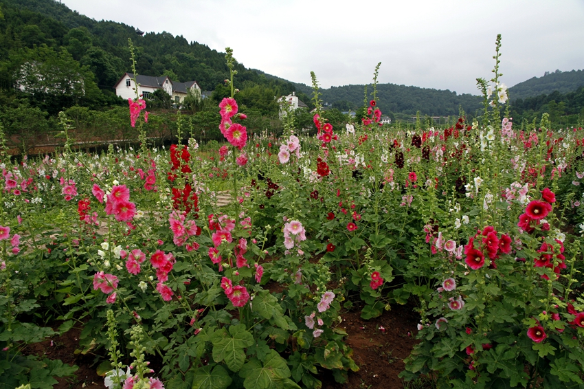 鲜花山谷面积1000余亩,300多亩蜀葵花海,是目前世界面积最大,品种最多(120余种)的蜀葵花海。