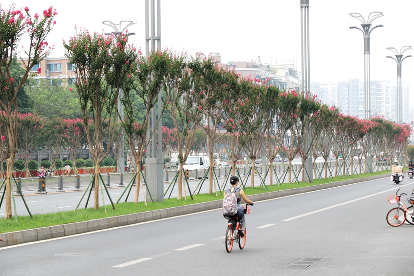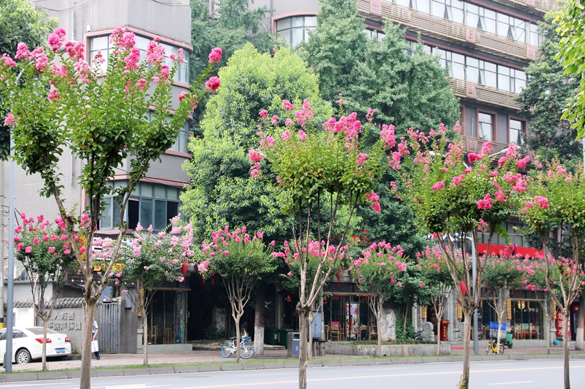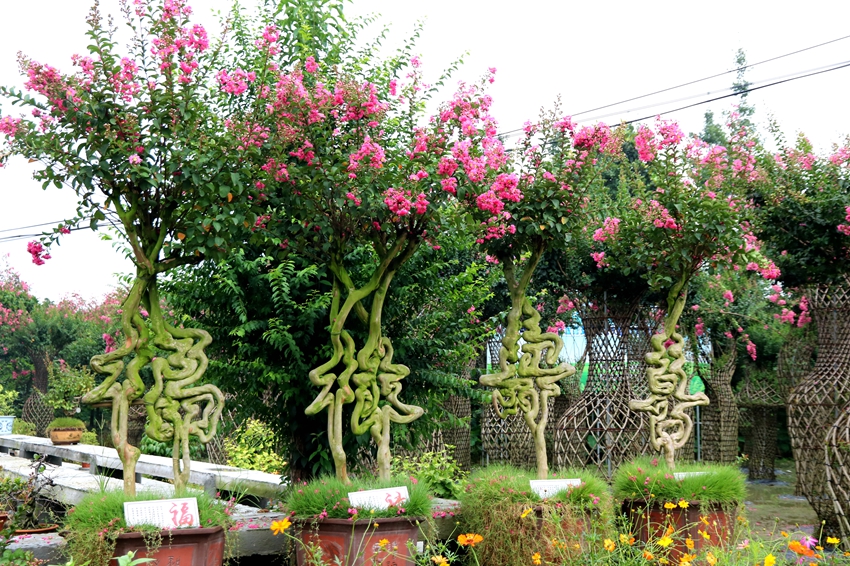 紫薇因其花期长、花量大、花色艳丽,在园林绿化中应用极广。修剪过的紫薇花枝齐整,可作为行道树;独干紫薇可孤植;丛生状紫薇可丛、列或片植等。当然紫薇还有一个很大的有点就是,花枝纤长柔软、树干光滑,极为适合编艺造型,目前温江的编艺公园里,各种特色紫薇编艺造型,让人惊叹不已,不得不感叹编艺师傅的匠心独具。