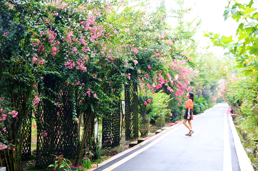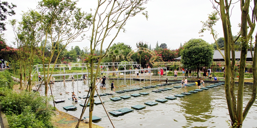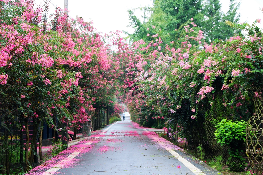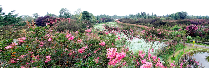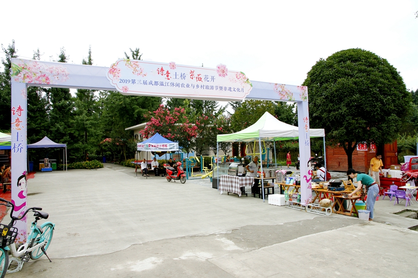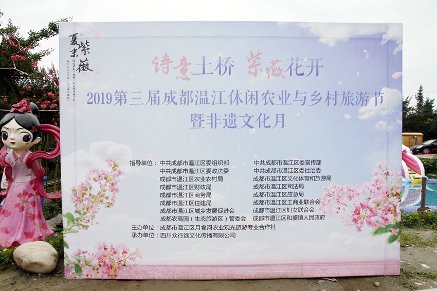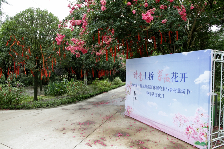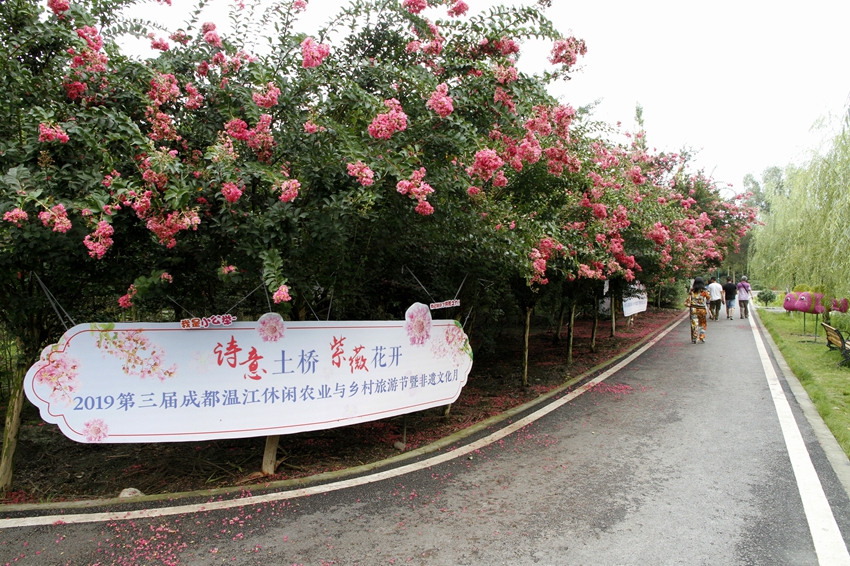 目前正在着力打造500亩的紫薇田园中心景区,主题为“情意土桥、紫薇花开”的2019第三届成都温江休闲农业与乡村旅游节暨非遗文化月正在进行中。园区内高大紫薇多不胜数,树上繁花似锦,树下闲庭落花,紫薇林道清丽秀美。还有小火车、紫薇书画、戏水、和盖碗茶等。