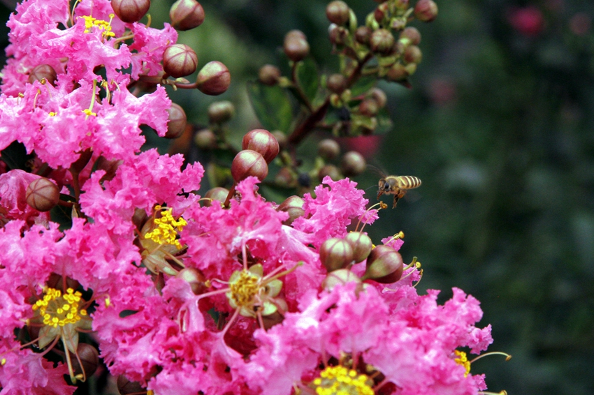 紫薇花期极长,可从6月开至9月,因此有“百日红”之称,宋代诗人杨万里赞颂 “谁道花无红百日,紫薇长放半年花。”紫薇还有一个名字叫“痒痒树”,轻轻捞捞光滑的树干,树枝便微微轻颤,特别有趣,相信不少朋友都试过。紫薇还具有药用,李时珍在《本草纲目》中论述,其皮、木、花有活血通经、止痛、消肿、解毒作用。