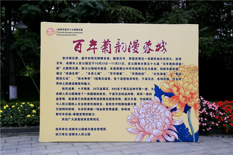 成都市第五十九届菊花展于10月23日至11月21日在人民公园举行。本届菊展以“百年菊韵漫蓉城”为主题,助力公园城市建设。菊展以中华传统菊花文化为基础,创新布展思路,共展出菊花800多个品种,20万余盆,通过“成渝生辉”、“未来之城”、“芳华雅集”、“芳菊秋韵”、“红色源泉”、“爱成都迎大运”、“秋光争艳”七组菊花造景,各造型各具特色、千姿百态,为金秋奇妙之旅增添了精致和魅力,欢迎广大游客前来赏菊观花。
