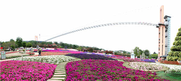 游览攻略:1、特色点位:网红玻璃桥:高近50米,长度228米的高空透明玻璃桥,俯瞰整个花海,体验高空明的新鲜与刺激。九曲花海:大面积的鲜花展示区域,(种植虞美人,郁金香,百合花,菊花,目前是矮牵牛花开放)。七彩花田:大面积鲜花种植区域,搭配热气球造景(种植向日葵,马鞭草等,目前是飞燕草,毛地黄,大花葱正在开放。爱情天梯:彩虹色天梯拱廊,拱廊覆盖了精品龙沙宝石,非常浪漫和震撼。(玫瑰花正在开放)。法式玫瑰园:超长龙沙宝石墙,精品玫瑰和欧月。(玫瑰花正在开放)。达芬奇玫瑰园:各类玫瑰花和拱廊造型玫瑰月季。(玫瑰花正在开放)