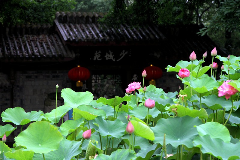 约30亩荷塘,红花荷叶相映,弱柳清风微拂,亭台楼阁隐现,古风古韵尽显。