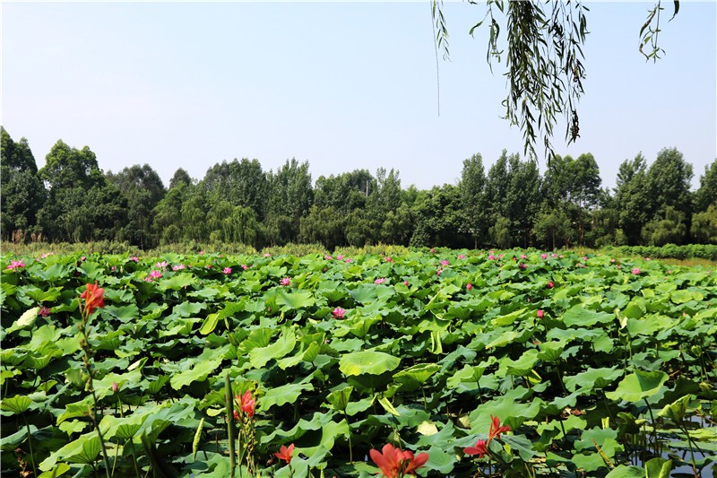 大片的红色、白色荷花,配有美人蕉、睡莲、再力花、水葱、梭鱼草等,另有扶风绿柳,曲折回廊,景观步道。