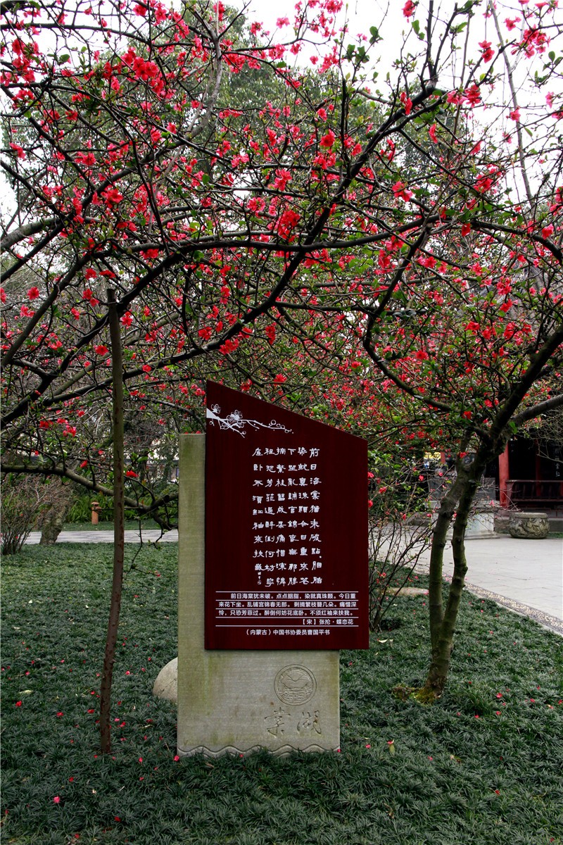 公园占地200余亩,园区汇集众多海棠品种,精心配植,巧妙布局,展现各种海棠美妙风姿;更有楼台掩映、亭廊错落、静湖流渠、石刻木雕等,无不体现川西古典园林风貌。