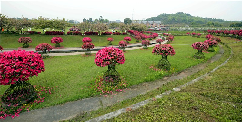 春天的花舞人间,最让人期盼的就是漫山遍野的杜鹃花,2020年花舞人间的杜鹃花节已拉开帷幕。花舞人间是整个西南地区人工培育杜鹃花最大的展示基地,拥有近百个品种,500多万株的数量,“百万杜鹃,花舞人间”已成为其著名的广告语。其中最有特色的当然还是花舞人间全球独有、树龄20余年的镇园之宝——杜鹃花瓶,荷塘边、道路旁,一排排镂空的植物造型花瓶,上面开满鲜艳的杜鹃花,醒目耀眼。