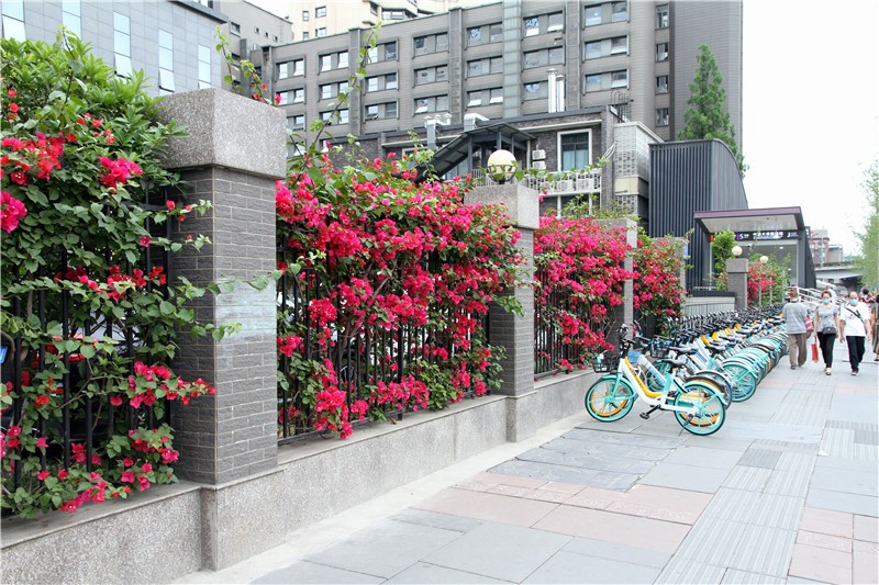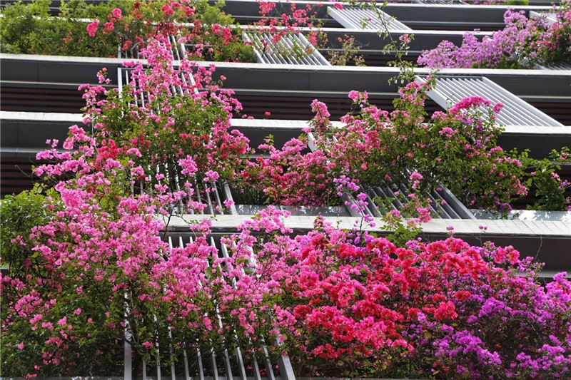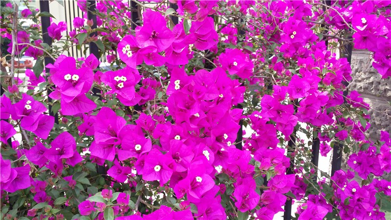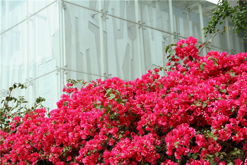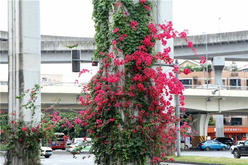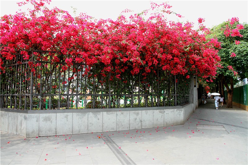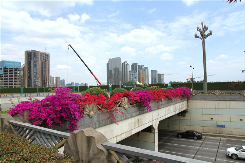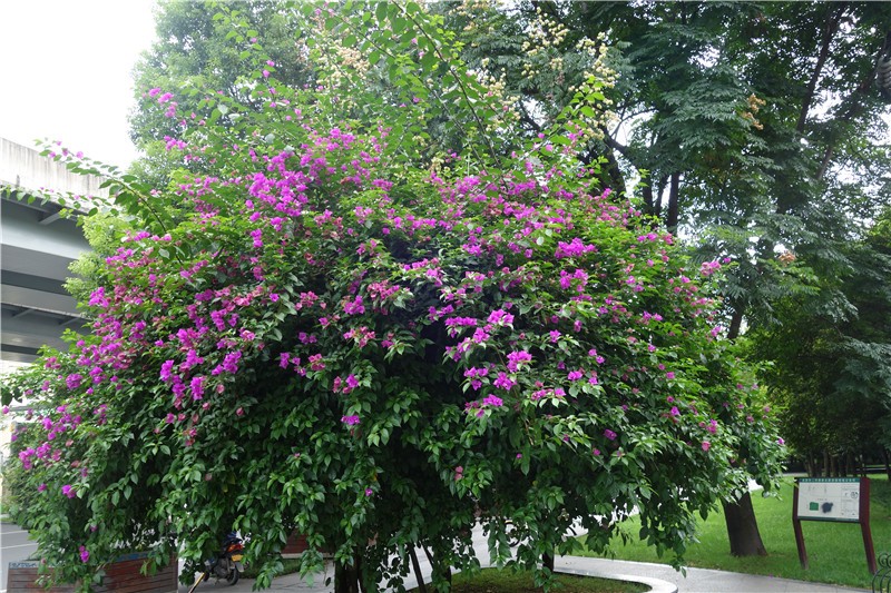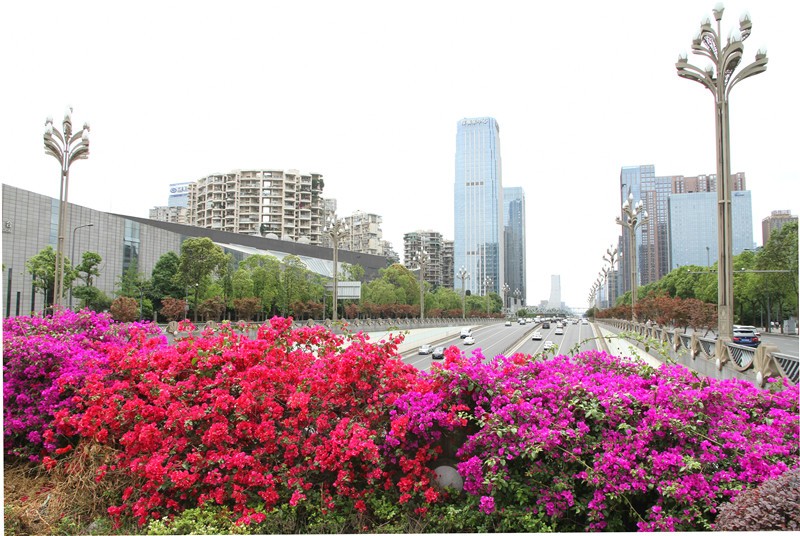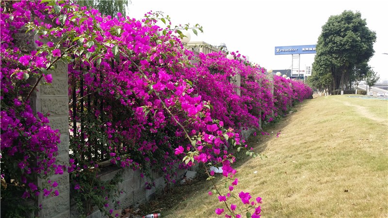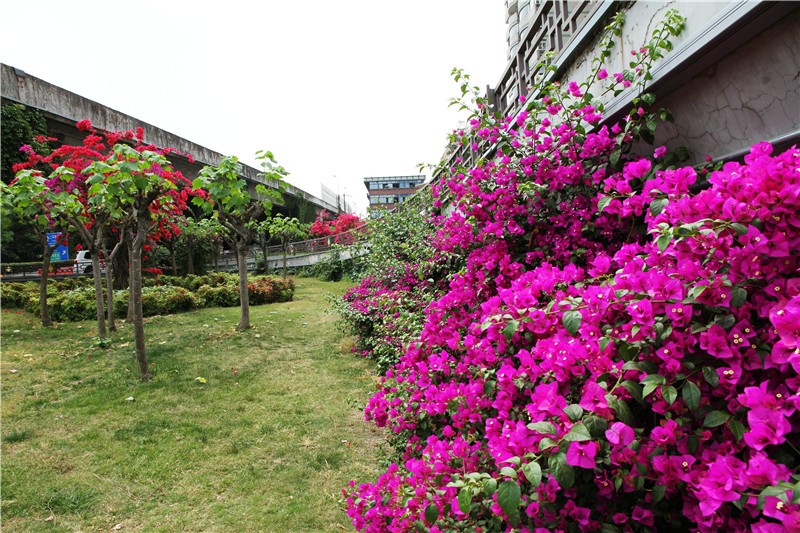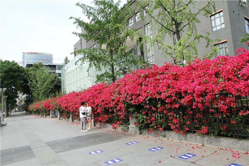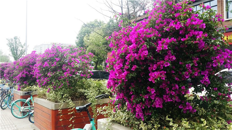三角梅虽然种类不多,但因其花量繁多,花期长(一般可从5月一直盛开到10月左右),盛花时,热情奔放、灿烂夺目。人们对其极为喜爱,其育种培育也发展蓬勃,培育出了超多观赏价值极高的园艺品种。从花型上分有单瓣和重瓣,色系上分有单色、斑叶、渐变色等,其中单色就有白、粉红、水红、鲜红、暗红、紫红、蓝紫、柠檬黄等色,在加上复色品种,只色彩上够你眼花缭乱。再加上三角梅的藤蔓特性,可以作各种编艺造型、搭廊架亭、编篱爬墙……园林应用上形式方法多种多样,只用三角梅就能呈现不同的风景。目前,成都城区绿地、道路、小游园、屋顶、露台、阳台、花箱、花墙、绿篱等几乎都有其身影,栽种较多的是红色系和蓝紫色。
