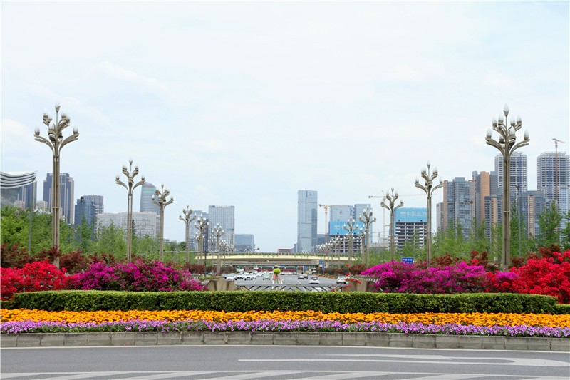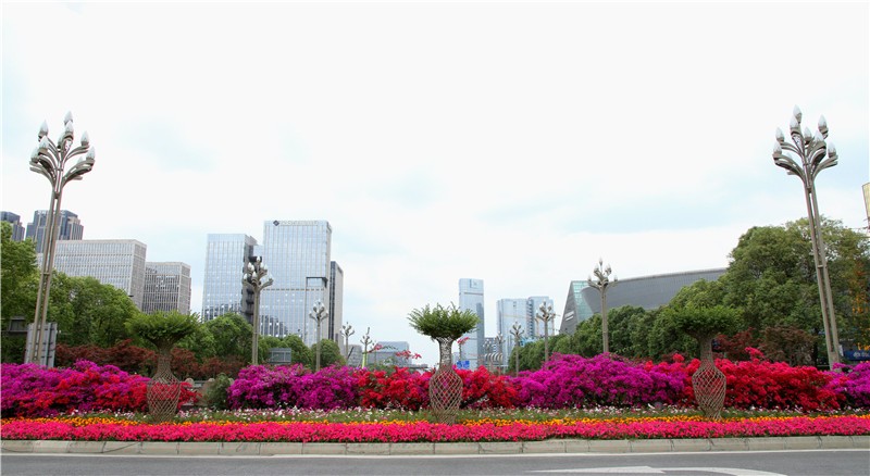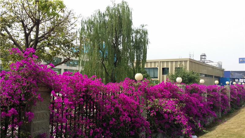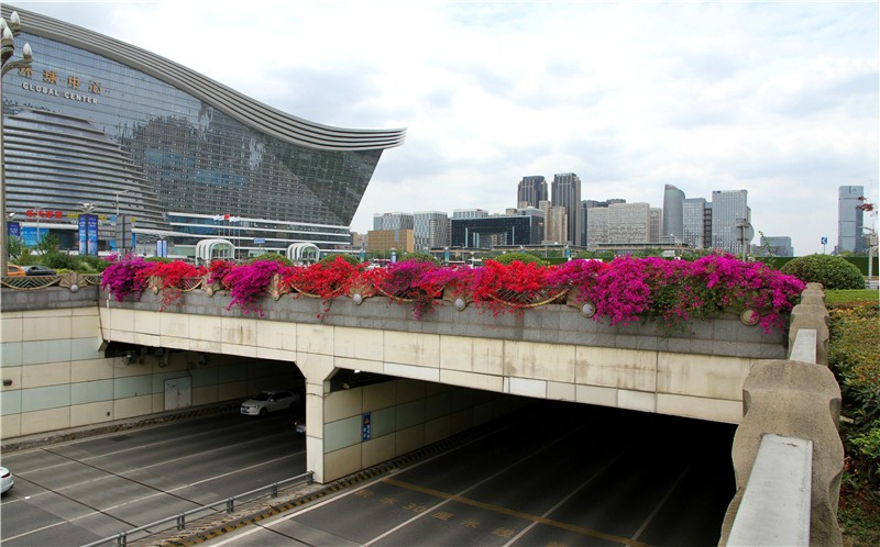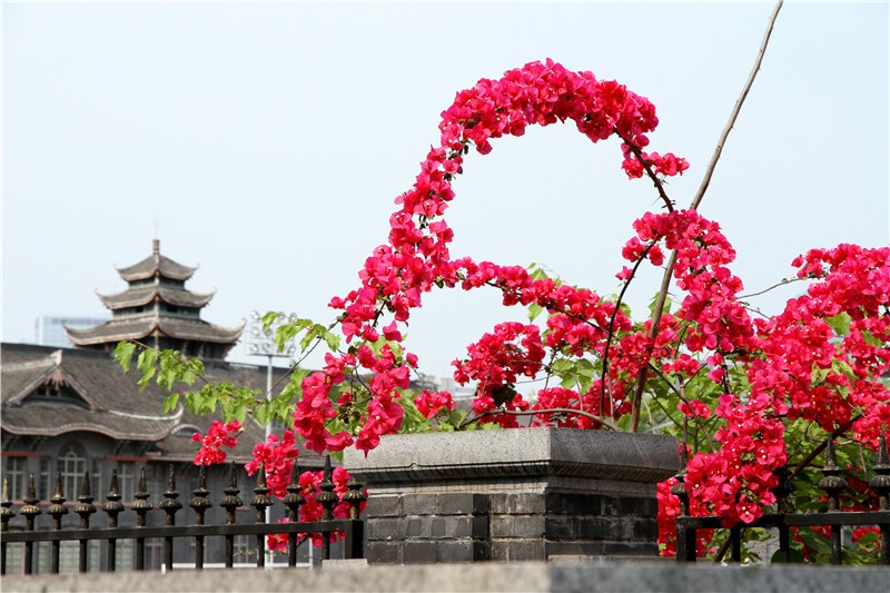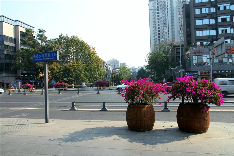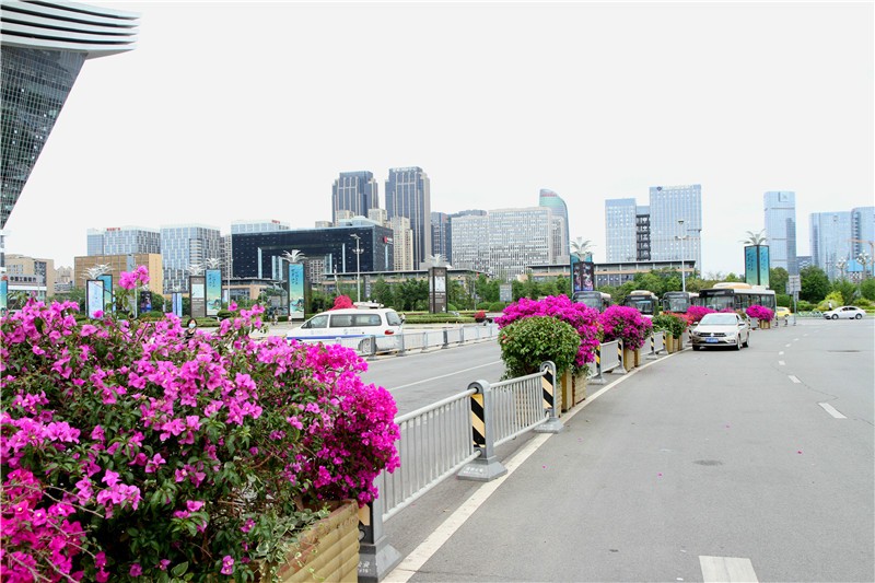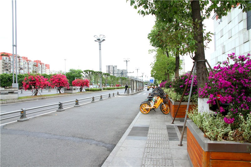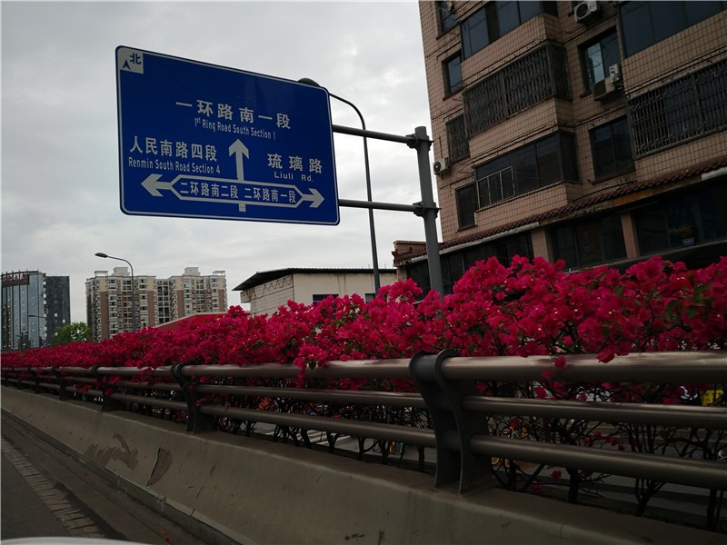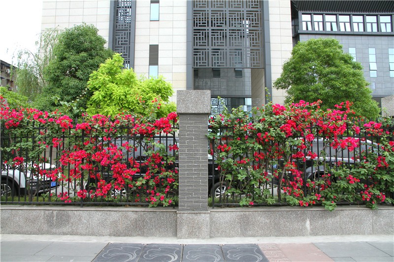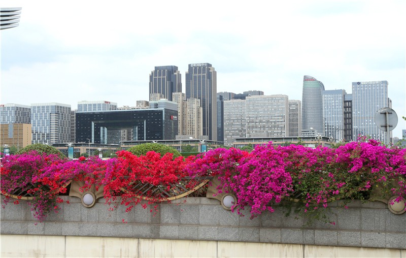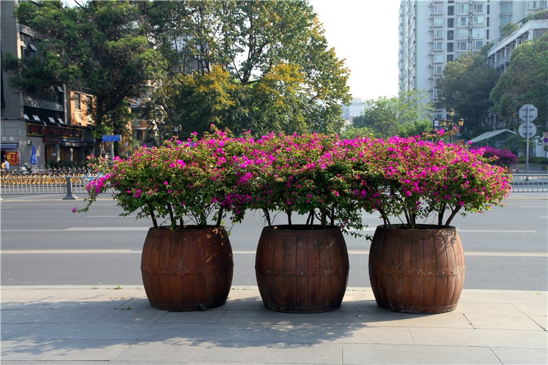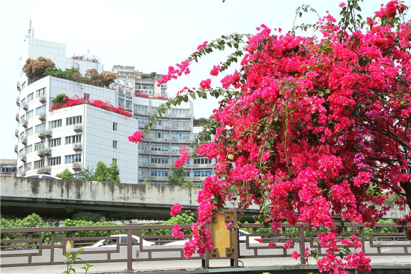三角梅虽然种类不多,但因其花量繁多,花期长(一般可从5月一直盛开到10月左右),盛花时,热情奔放、灿烂夺目。人们对其极为喜爱,其育种培育也发展蓬勃,培育出了超多观赏价值极高的园艺品种。从花型上分有单瓣和重瓣,色系上分有单色、斑叶、渐变色等,其中单色就有白、粉红、水红、鲜红、暗红、紫红、蓝紫、柠檬黄等色,在加上复色品种,只色彩上够你眼花缭乱。再加上三角梅的藤蔓特性,可以作各种编艺造型、搭廊架亭、编篱爬墙……园林应用上形式方法多种多样,只用三角梅就能呈现不同的风景。目前,成都城区绿地、道路、小游园、屋顶、露台、阳台、花箱、花墙、绿篱等几乎都有其身影,栽种较多的是红色系和蓝紫色。