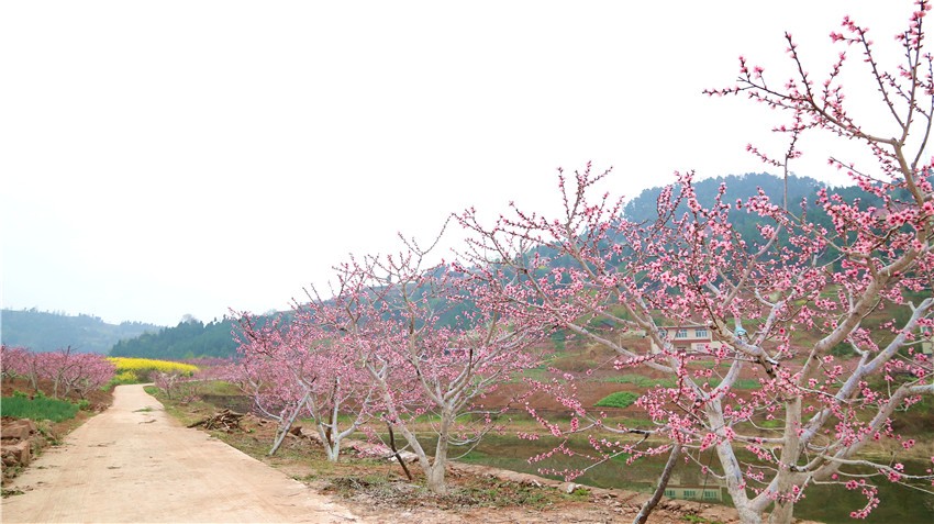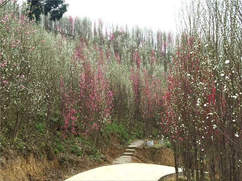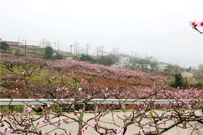 水蜜桃种植面积约3000亩,3月桃花开放,漫山遍野红粉片片,间有白色的李花、梨花,黄色的油菜花等,让游客大饱眼福。