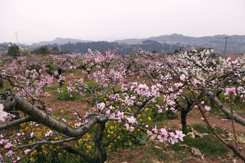 水蜜桃种植面积约3000亩,3月桃花开放,漫山遍野红粉片片,间有白色的李花、梨花,黄色的油菜花等,让游客大饱眼福。