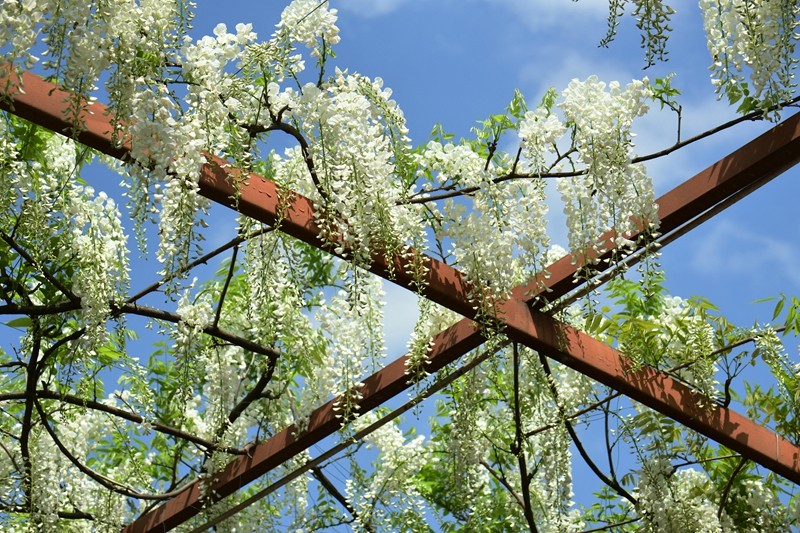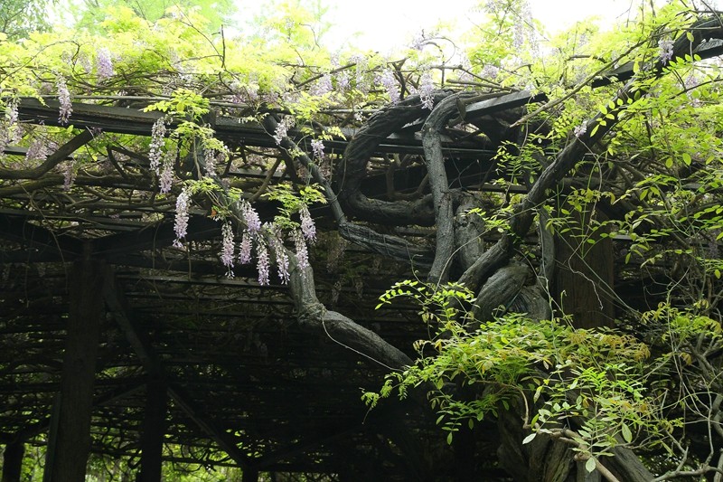 紫藤,别名藤萝、朱藤、招藤、招豆藤,属豆科植物。是落叶攀援缠绕性大型藤本观花植物,春季开花,花白色、青紫色居多,总状花序,排列整齐,长度一般30厘米左右,长的可达50厘米甚至以上,很是壮观。紫藤广泛分布于中国境内,具有较高的园艺装饰价值。