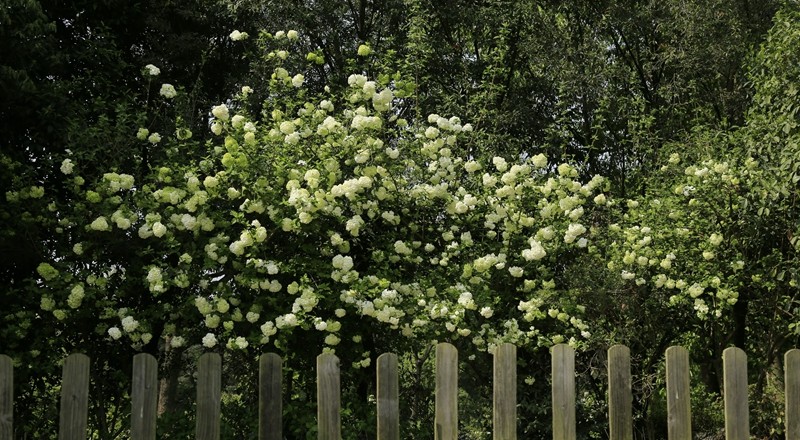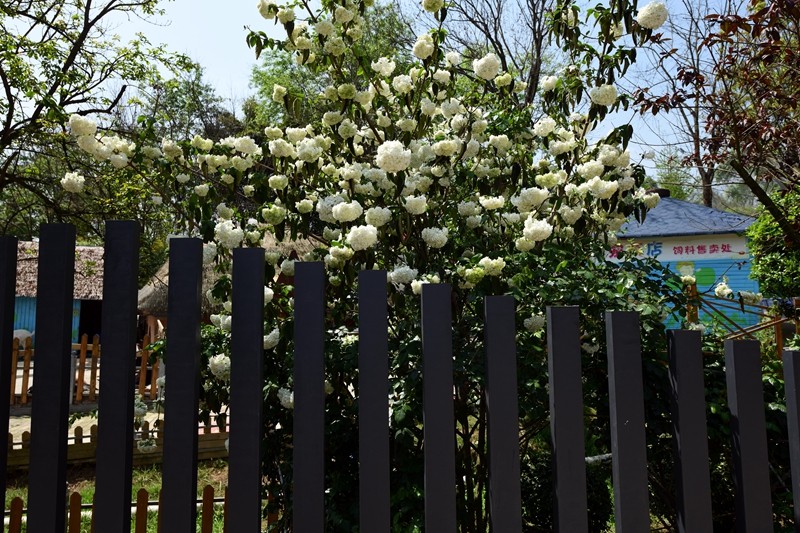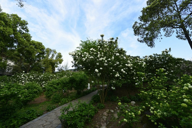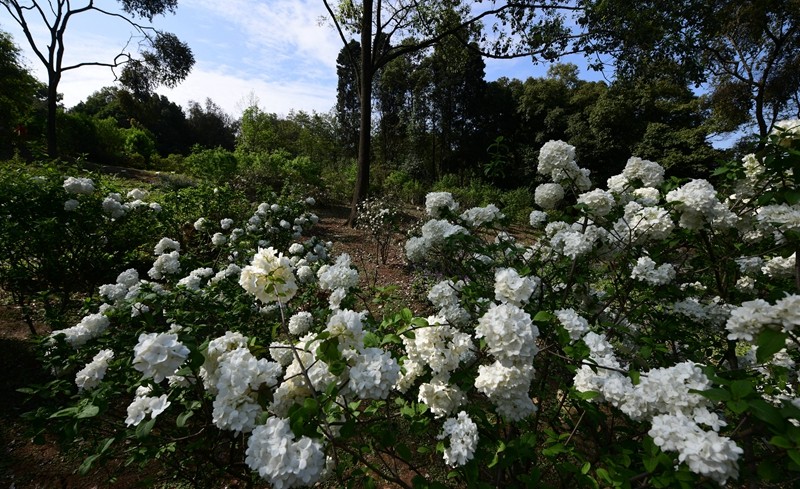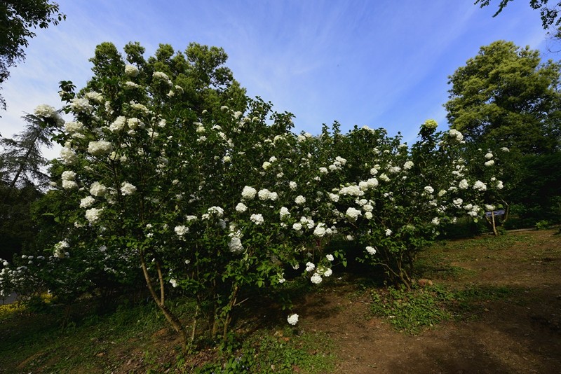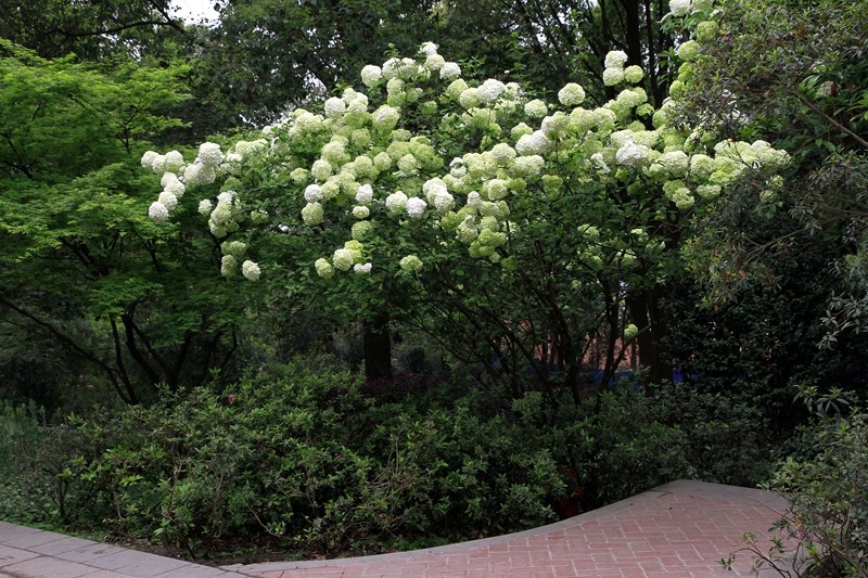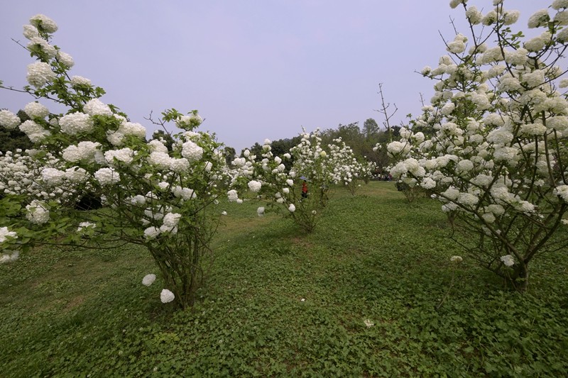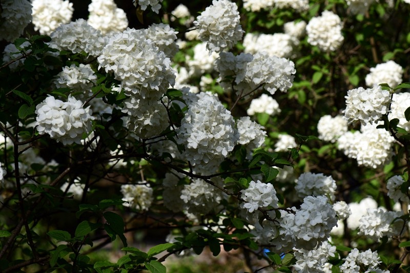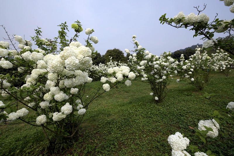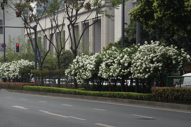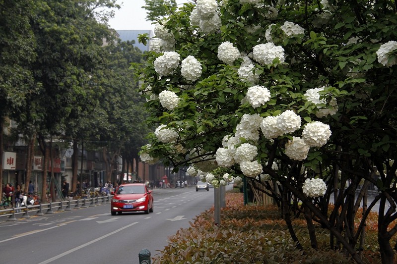 绣球荚蒾,又叫木绣球,忍冬科荚蒾属落叶灌木。绣球荚蒾的聚伞花序全部由不孕花组成,花量极多,且花期较长,盛花期即可持续半月,有时9-11月的二次花期也都有一定的观赏效果。不孕花开时由绿色渐变为纯白色,盛开时一个个花序呈纯白色绣球状矗立枝头,又似白色棉花团挂在树梢,成片种植时花开白茫茫一片,极具观赏性。绣球荚蒾在成都园林绿化中已有应用,目前在成都市植物园、花舞人间、漫花庄园、新华大道等都能看到徐徐盛开的绣球荚蒾。