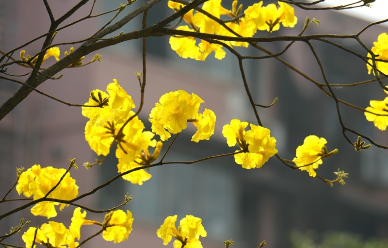 黄花风铃木随着四季变化而展现不同风貌:春天枝条叶疏,清明节前后黄花满树;夏天长叶结果荚;秋天枝叶繁盛,一片绿油油的景象;冬天叶落枝枯,呈现出萧瑟之象。