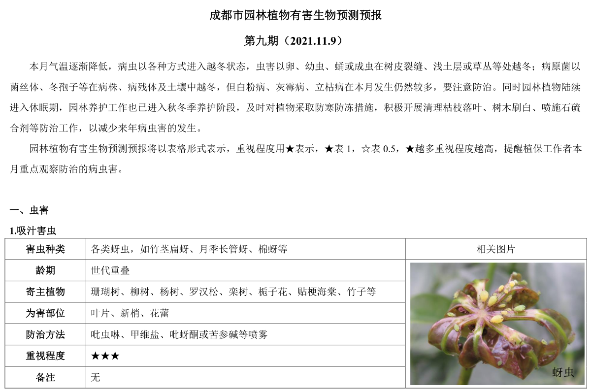 成都市园林植物有害生物预测预报 第九期(2021.11.9)