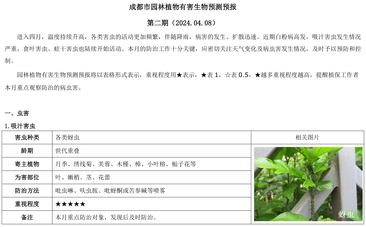 成都市园林植物有害生物预测预报 第二期(2024.04.08)