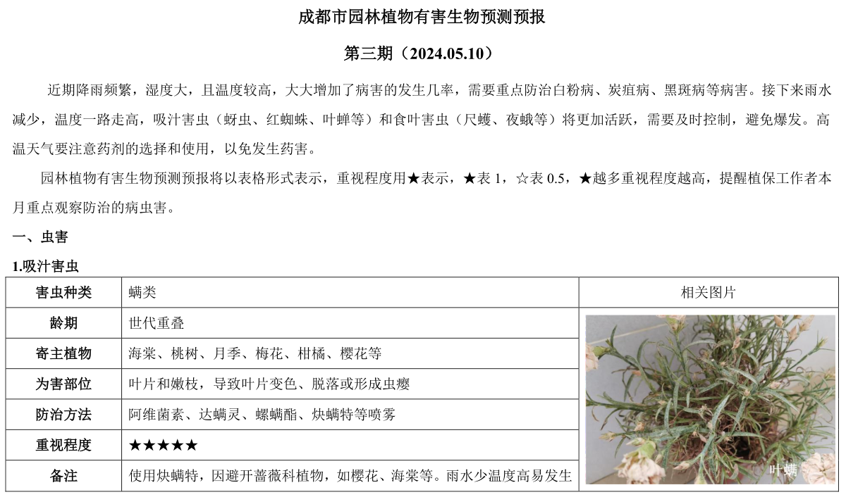成都市园林植物有害生物预测预报 第三期(2024.05.10)