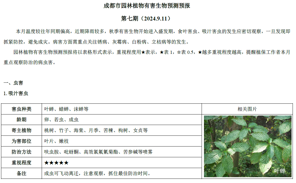 成都市园林植物有害生物预测预报 第七期(2024.9.11)